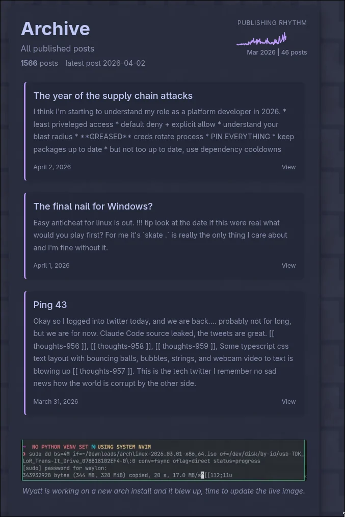 Sparklines On The Feeds Header Waylon Walker Author April 2, 2026 1 min read View of the new markata-go feeds header with the banger of a sparkline. Copy this post URL Rich Markdown Text View Markdown View Text curl .ansi View of the new markata-go feeds header with the banger of a sparkline.