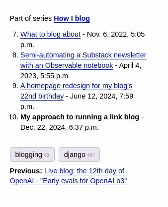 I just noticed that Simon has Series on his blog in a very elegant way. One I need to get back to blogging more, I did not do so good in 2024, and two this is awesome and I want it.