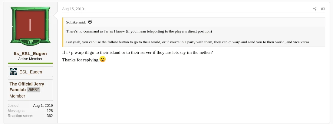 π Teleport to coop partner | Hypixel Forums Waylon Walker Author December 30, 2024 1 min read !https://hypixel.net/threads/teleport-to-coop-partner.2250505/ Copy this post URL Rich Markdown Text View Markdown View Text curl .ansi Teleport to coop partner Hello, Is there a command where you can teleport to your coop partner? Or is it just this Follow button in chat? :) Hypixel Forums Β· hypixel.net /p warp will warp your party to your current server in hypixel skyblock Note This post is a thought. Itβs a short note that I make about someone elseβs content online #thoughts