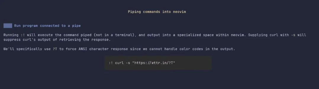 π Wrapping your favorite CLI in neovim - YouTube Waylon Walker Author December 31, 2024 1 min read !https://www.youtube.com/watch?v=rerTvidyz-0&t=160s Copy this post URL Rich Markdown Text View Markdown View Text curl .ansi cool video on expanding vim with cli. piping commands into vim # write a healthcheck # Note This post is a thought. Itβs a short note that I make about someone elseβs content online #thoughts