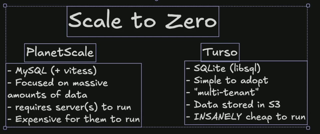 Companies that can run on scale to zero can allow your shitty side projects that have no users run for free indefinitely because it costs them nothing. He compares planetscale running mysql vs Turso running SQLite stored in s3.