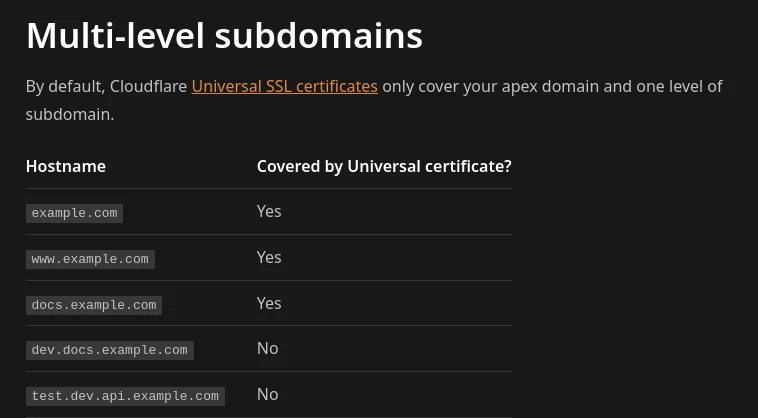 By default, Cloudflare Universal SSL certificates only cover your apex domain and one level of subdomain.