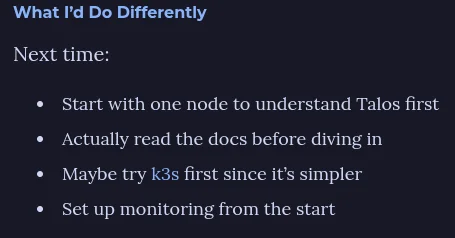 Iβve ran my homelab on k3s for a year and a half now, and have had talos fomo the whole time. Iβm not sure if this article helps or hurts. Helps to see that techdufus struggled and wished he went k3s first, but theres so much good to it that I want it.