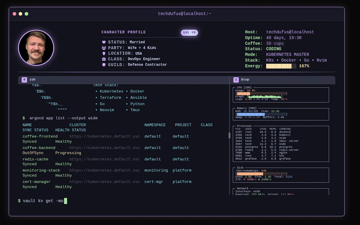 π { TechDufus } Waylon Walker Author July 2, 2025 1 min read !https://techdufus.com/#timeline Copy this post URL Rich Markdown Text View Markdown View Text curl .ansi Home | { TechDufus } TechDufus writes about platform engineering, homelab rebuilds, and agent workflows that hold up in the real world. { TechDufus } Β· techdufus.com This has to be top tier dopest home page of all time. The commands are all so well customized and whimsical on the terminal. Note This post is a thought. Itβs a short note that I make about someone elseβs content online #thoughts